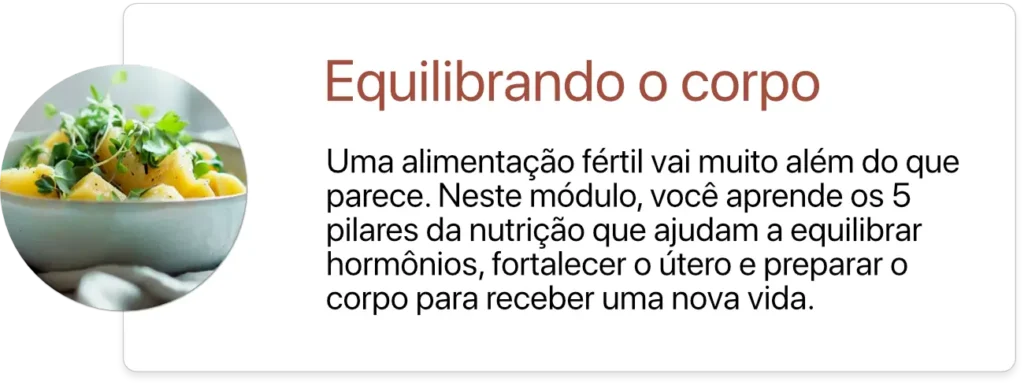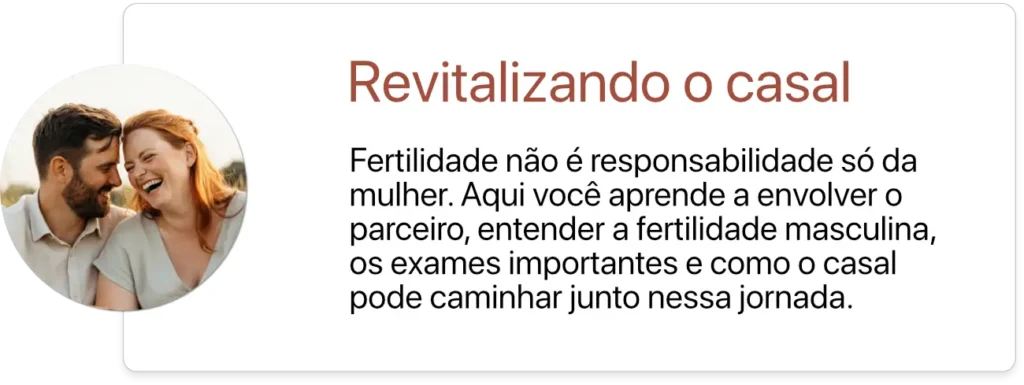 A Dra. Loraine explica a importância do apoio do parceiro, mas enfatiza que a mulher pode fazer sua parte e melhorar a própria fertilidade. Dentro do curso tem também aula para a fertilidade masculina, que você mesma pode aplicar algumas mudanças no dia a dia, além da suplementação.